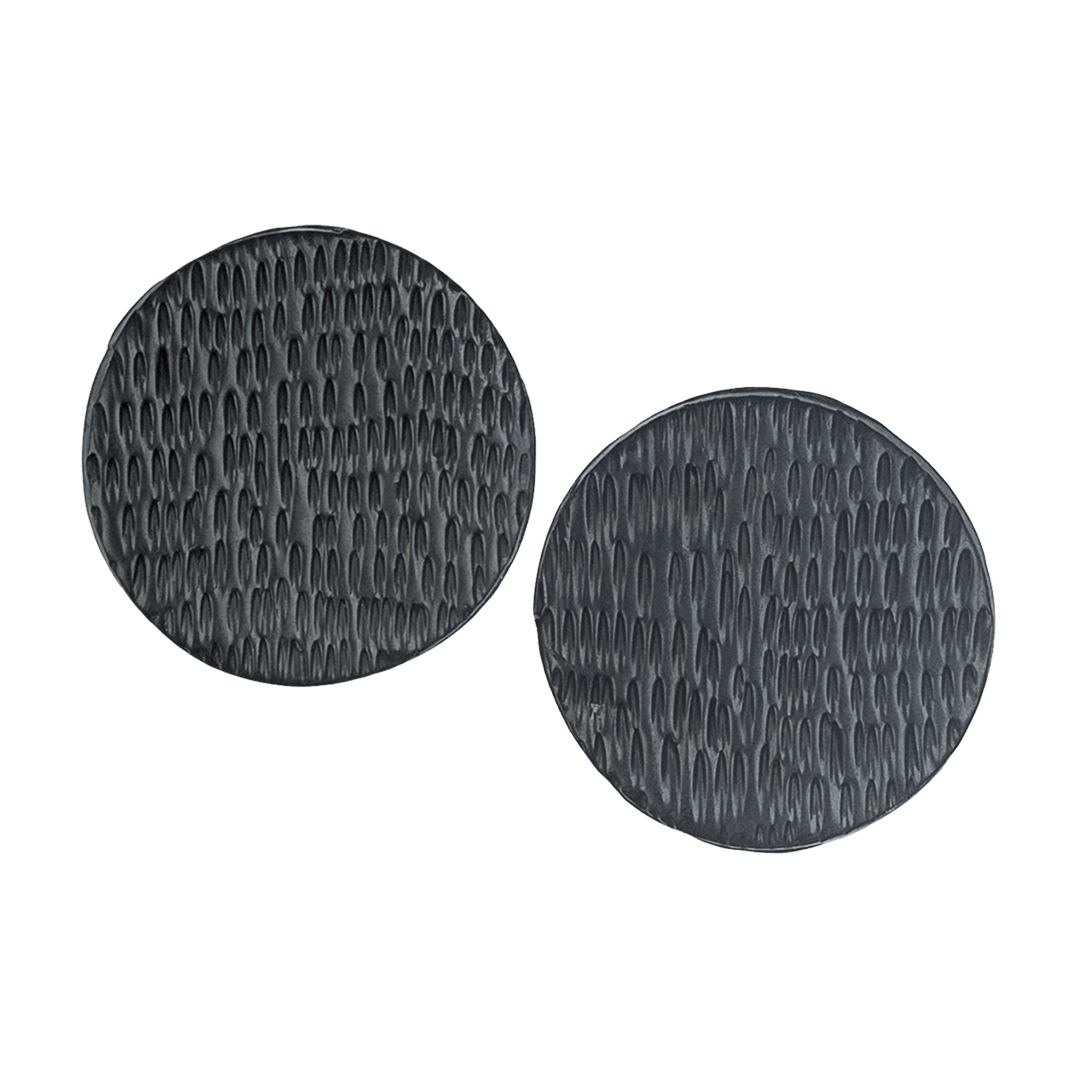 These sophisticated jet-black studs showcase our signature linear texture at a versatile scale. Each piece features meticulous, hand-detailed patterns that create subtle depth and dimension.